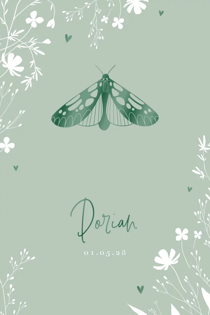 Prachtige geboortekaart in zachtgroene tint met donkergroene mot en hartjes in hoogglans. De bloemen zorgen voor een lieflijk ontwerp. Pas dit ontwerp zelf aan in onze editor.