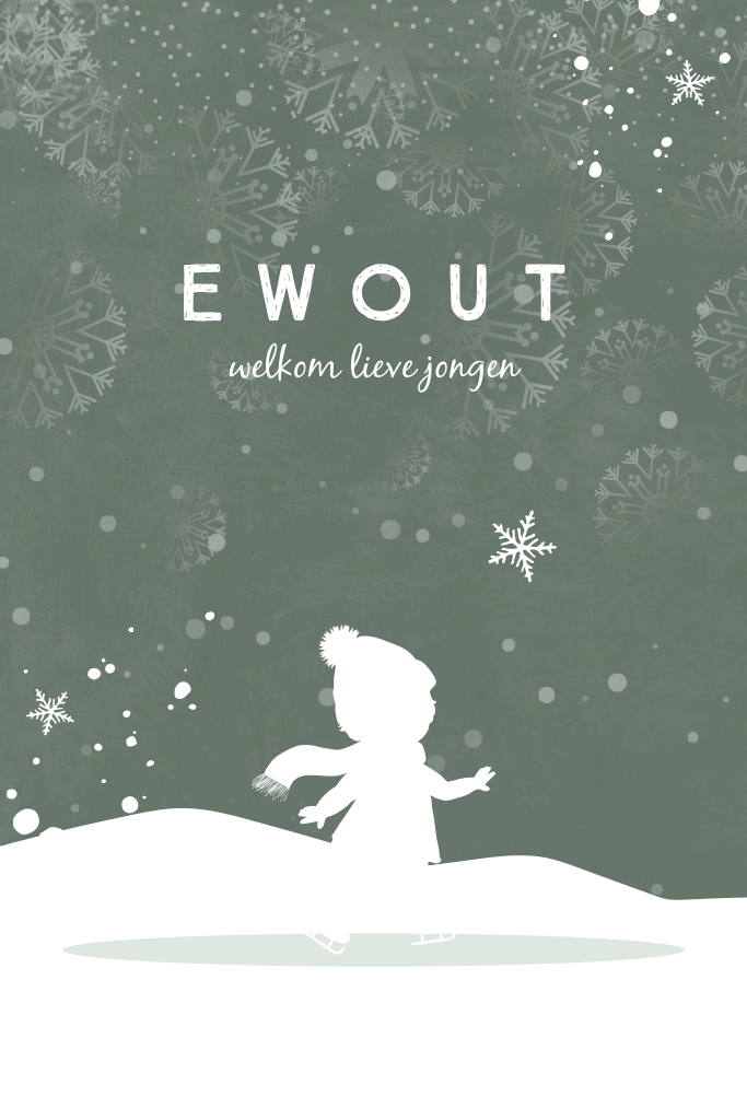 Leuk, groen geboortekaartje met winters thema. Voorop schaatst een klein silhouet jongetje in prachtig, glimmend goudfolie. Sneeuwvlokjes dwarrelen om hem heen en ook zijn naam komt in glinsterend folie op dit winterse ontwerp te staan. Kondig de komst van je winterkindje aan in stijl! Pas dit kaartje zelf aan in onze handige editor en bestel een proefdruk om deze in het echt te kunnen bewonderen.
