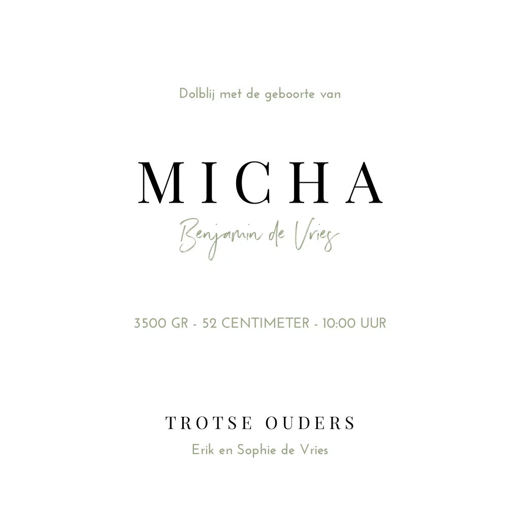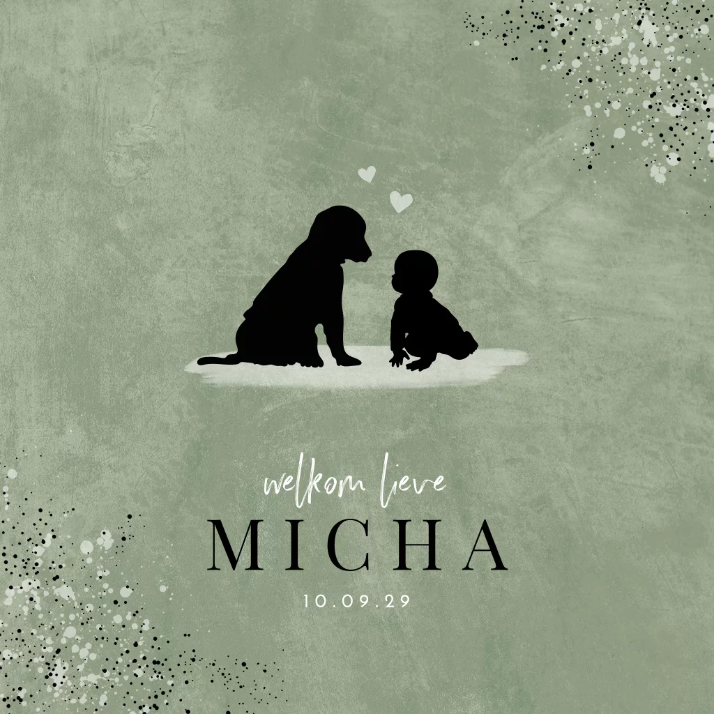 Heb je een hond en verwacht je een kindje? Kondig de komst van de kleine aan met dit groene geboortekaartje met silhouetjes van een hond en een baby. De kaart wordt verder versierd met spetters en waterverf vlekken. Pas de silhouetjes eventueel aan met behulp van onze editor. In het mapje 'Silhouet honden' vind je allerlei verschillende honden silhouetjes om zelf toe te voegen aan deze kaart.