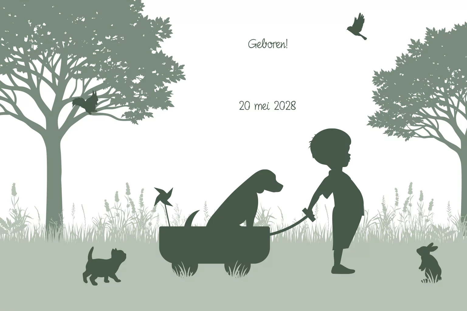 Een geboortekaartje met huisdier maakt het ontwerp extra persoonlijk. Jullie hond, kat of konijn hoort er natuurlijk helemaal bij! Op dit groene silhouet geboortekaartje zie je een jongetje die een karretje trekt met daarin de hond, terwijl de kat toekijkt en een lief konijntje in het gras zit. In onze editor kun je eenvoudig dieren toevoegen of aanpassen. Kies uit verschillende huisdieren en maak zo een kaartje dat echt bij jullie gezin past.