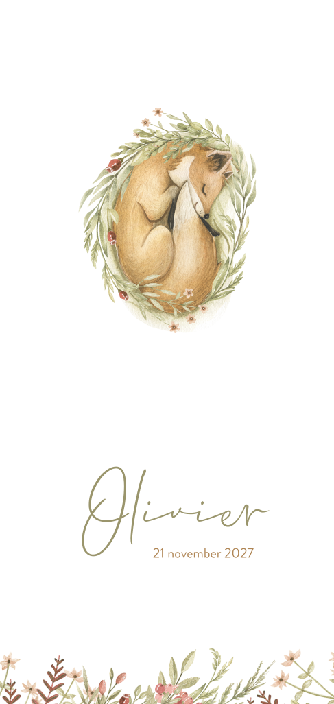 Dit langwerpige geboortekaartje is perfect voor het aankondigen van de geboorte van een herfstkindje! Op de voorkant staat een illustratie van een slapende vos omringd door takjes en bloemen. Op de achterkant komt de vos terug en kun je alle informatie over je pasgeboren zoontje plaatsen. Liever een stoer lettertype? Pas dit ontwerp eenvoudig aan in onze ontwerptool en bestel een proefdruk om het resultaat te kunnen bewonderen.