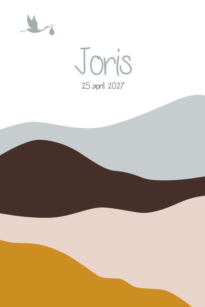Abstracte landschapjes zijn hip! Dus met dit abstracte geboortekaartje met heuvels in diverse kleuren zit je dus helemaal goed. De kleurvlakken kun je zelf nog van kleur wijzigen met de editor. Pas de kaart aan en bestel een drukproef.