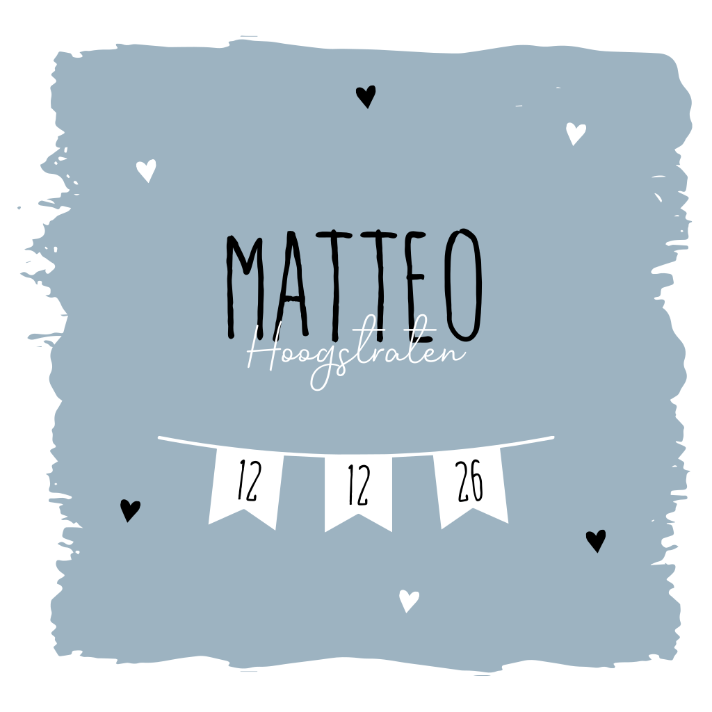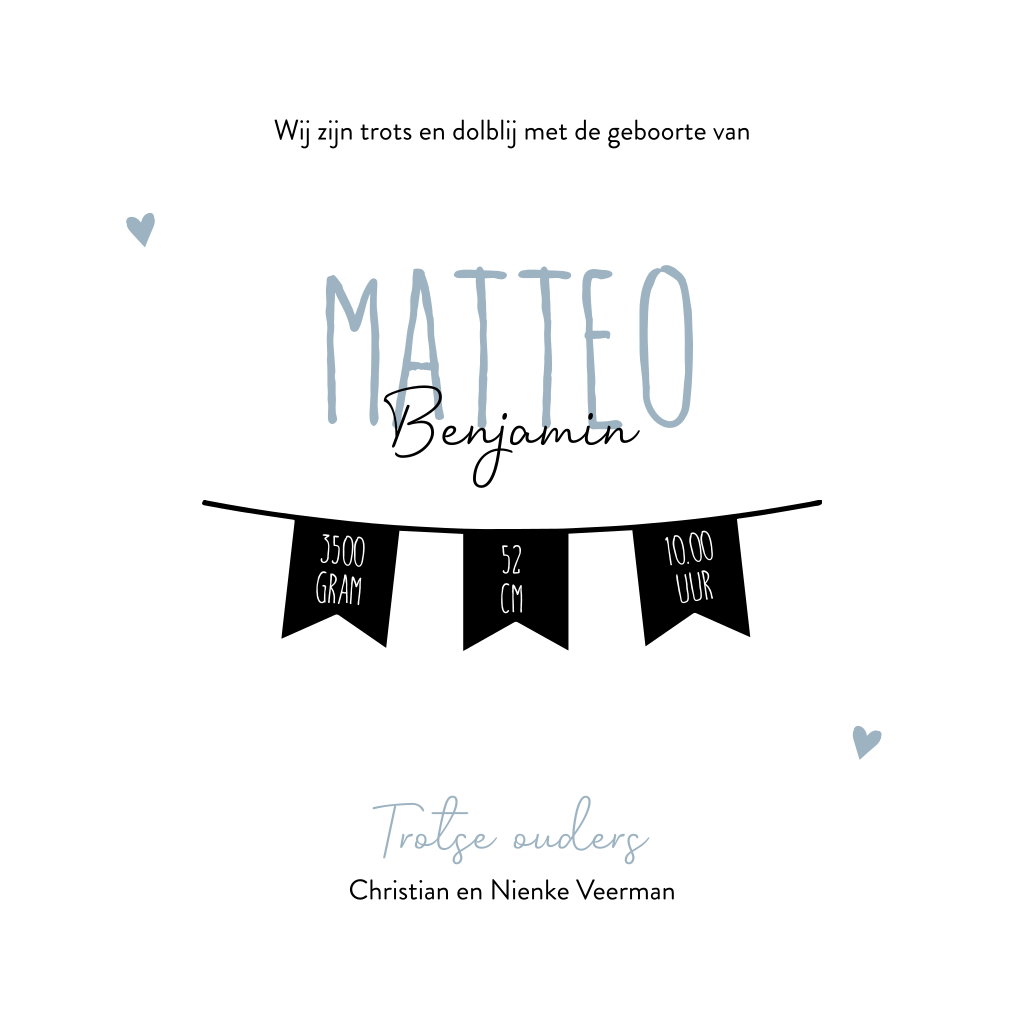 Een vierkant blauw geboortekaartje met vlaggetjes, typografie en hartjes. De naam van je pasgeboren zoontje komt in een hip lettertype voorop. De kleuren en lettertypes zijn gemakkelijk te wijzigen met behulp van onze handige ontwerptool. Zo maak je dit geboortekaartje helemaal naar je eigen zin. Benieuwd naar het eindresultaat? Bestel een proefdruk om deze lieve kaart in het echt te kunnen bewonderen.