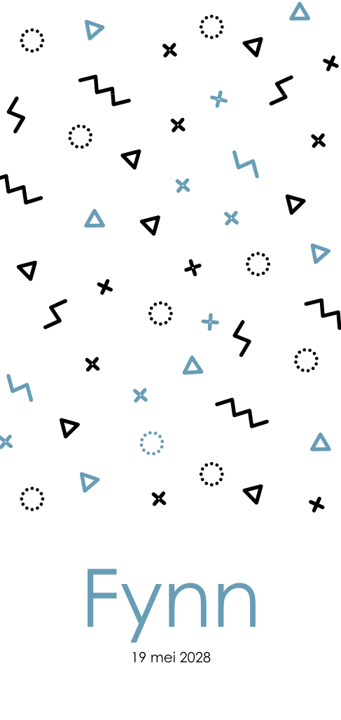 Grafisch geboortekaartje voor een zoon met een hip memphis patroon van driehoekjes, rondjes, kruisjes en streepjes in zwart en petrol blue.
