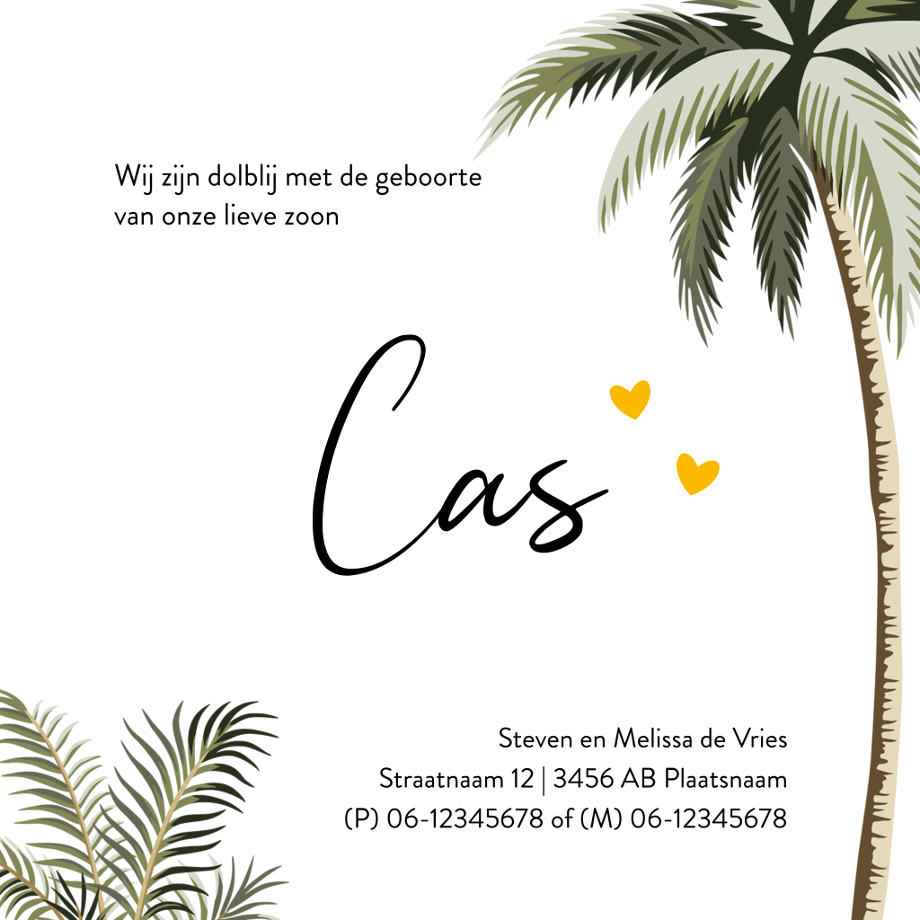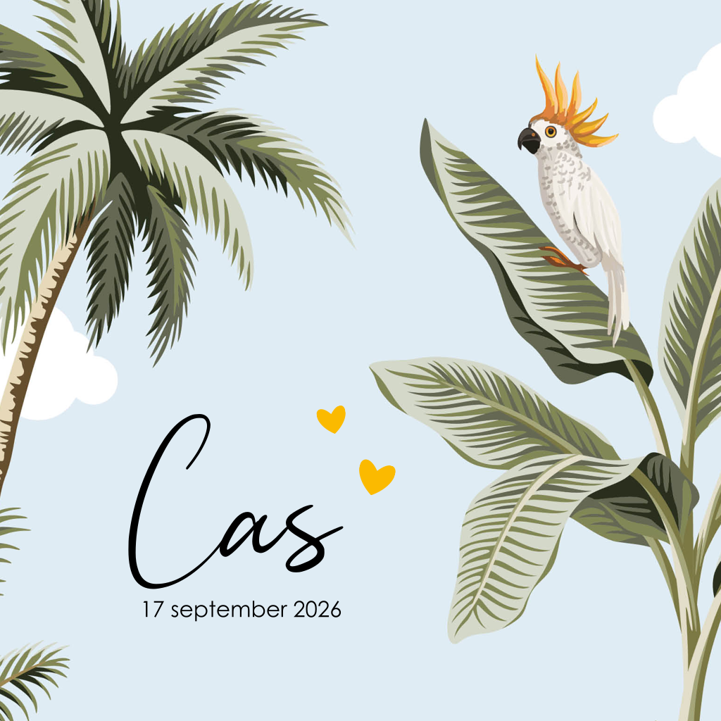 Jungle geboortekaartje met palmbomen en kaketoe. Ben je op zoek naar een jongens geboortekaartje met jungle thema? Kies dan dit tropische kaartje met kaketoe, palmbomen en gele hartjes voor je pasgeboren zoontje. Aan de binnenkant van de kaart komen de planten en kaketoe terug.