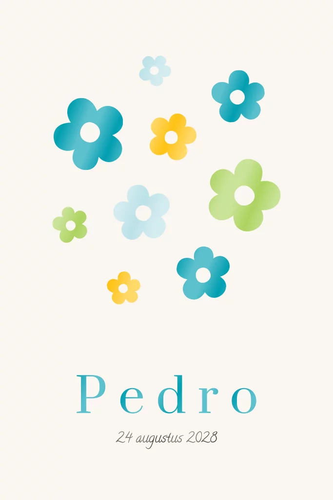 Een vrolijk en opvallend geboortekaartje met simplistische bloemen in geel, appeltjesgroen, aqua en lichtblauw. Alles op dit kaartje wordt in hoogglans gedrukt, dat maakt het een extra uniek exemplaar! Pas zelf alle kleuren aan in onze editor om je eigen draai te geven aan dit trendy ontwerp.