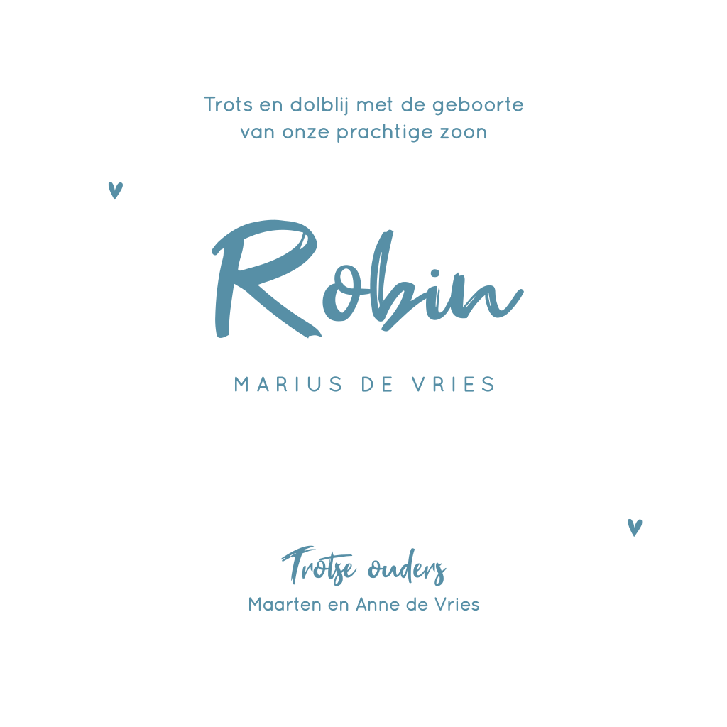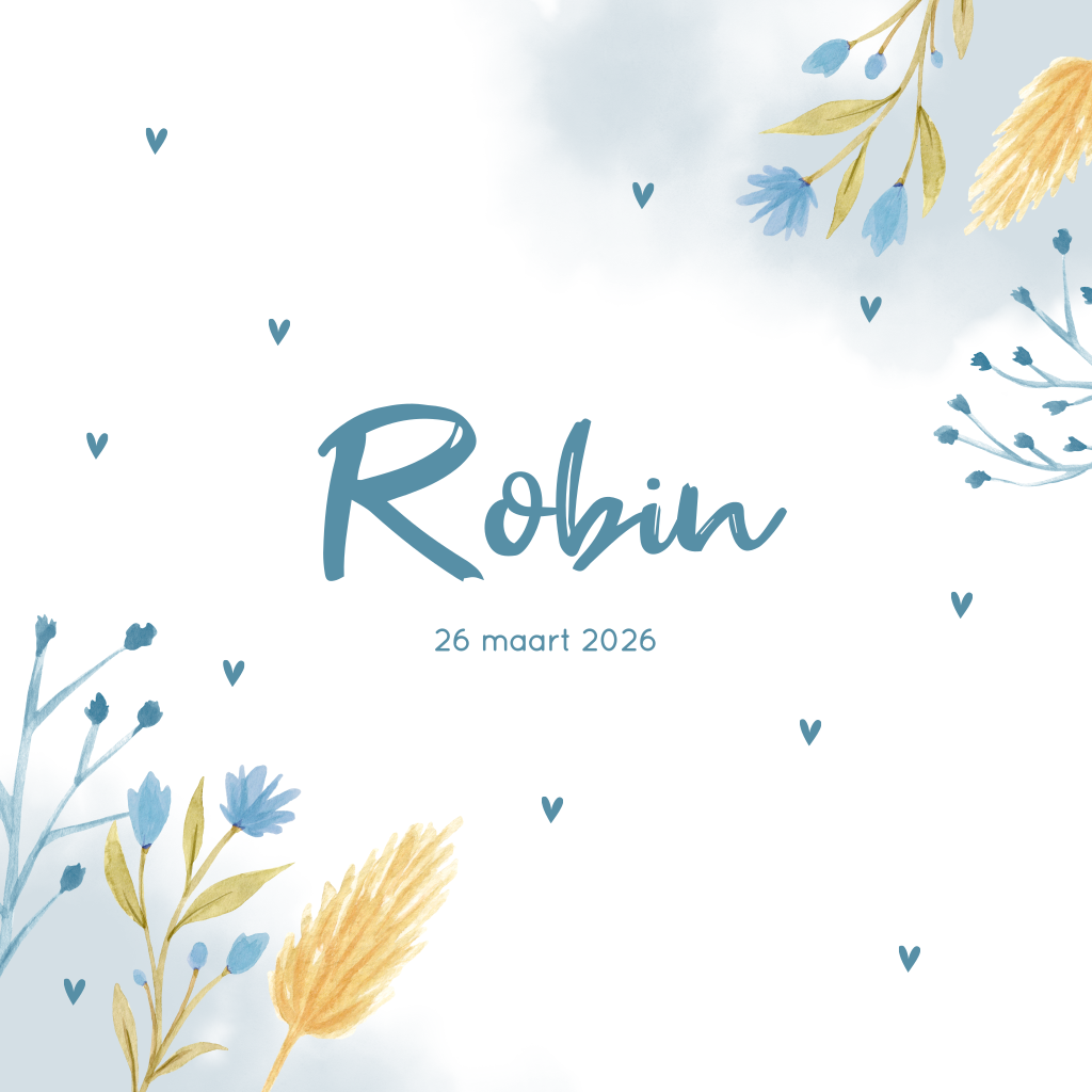 Lente geboortekaartje met blauwe bloemen en hartjes. Verwacht jij jouw kleine in de lente? Dan is dit geboortekaartje met schattige blauwe bloemetjes en zachte waterverf iets voor jou. De hartjes en de speelse typografie geven de kaart een vrolijk uiterlijk. Je kunt het ontwerp helemaal naar wens aanpassen in de ontwerptool. Tip, bestel een drukproef om jouw kaartje in het echt te beoordelen.