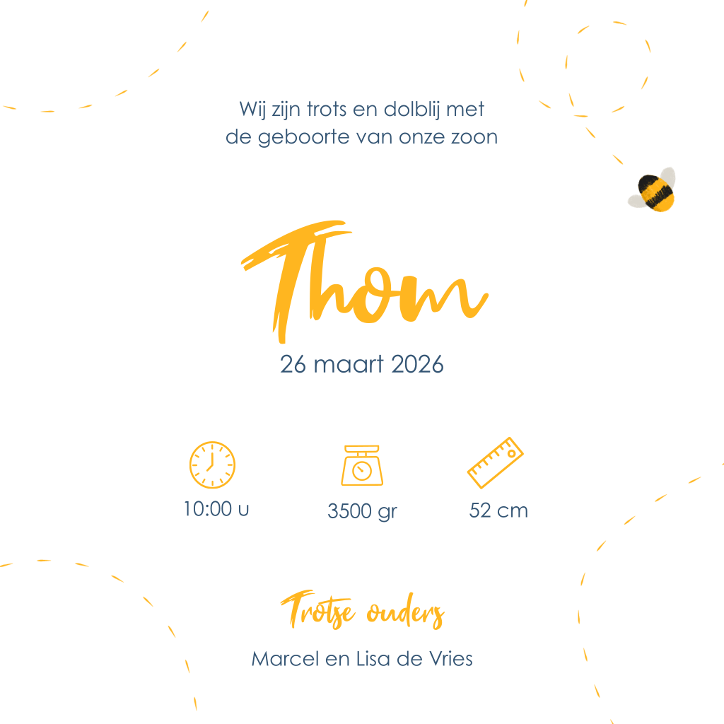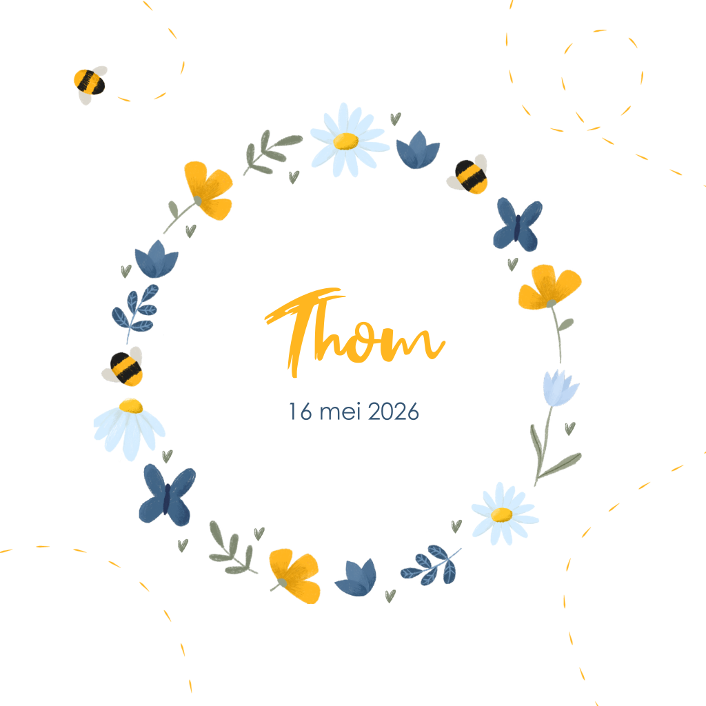 Geboortekaartje lente met gekleurde bloemenkrans en bijtjes. Op zoek naar een vrolijk lente geboortekaartje voor je zoontje. Kies voor dit speelse ontwerp met een gekleurde bloemenkrans. De krans is versierd met blauwe blaadjes, bijtjes en vlinders. In het midden staat de naam van je pasgeboren zoontje met speelse typografie. In de kaart is ruimte voor een mooie tekst en de geboortegegevens.