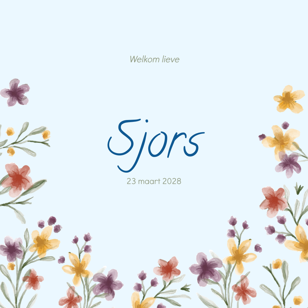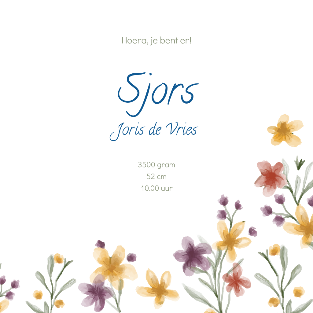 Wordt jouw zoontje deze lente geboren? Kies dan voor dit lieve voorjaars geboortekaartje met bloementjes in paars, geel en rood. Je kunt dit kaartje naar wens aanpassen met de designtool. En vergeet geen proefdruk te bestellen om de kaart eerst even in het echt te zien.