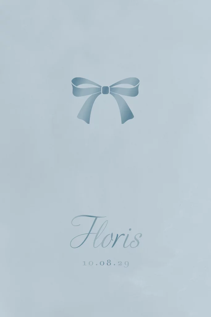 Lichtblauw geboortekaartje met grijsblauwe hoogglans strikje en klassieke uitstraling. Het strikje en de naam van je zoontje krijgen een mooie, glimmende laag. Liever een andere achtergrondkleur of de kleur van de hoogglans elementen aanpassen? Open het kaartje in onze editor en geef er je eigen creatieve draai aan.