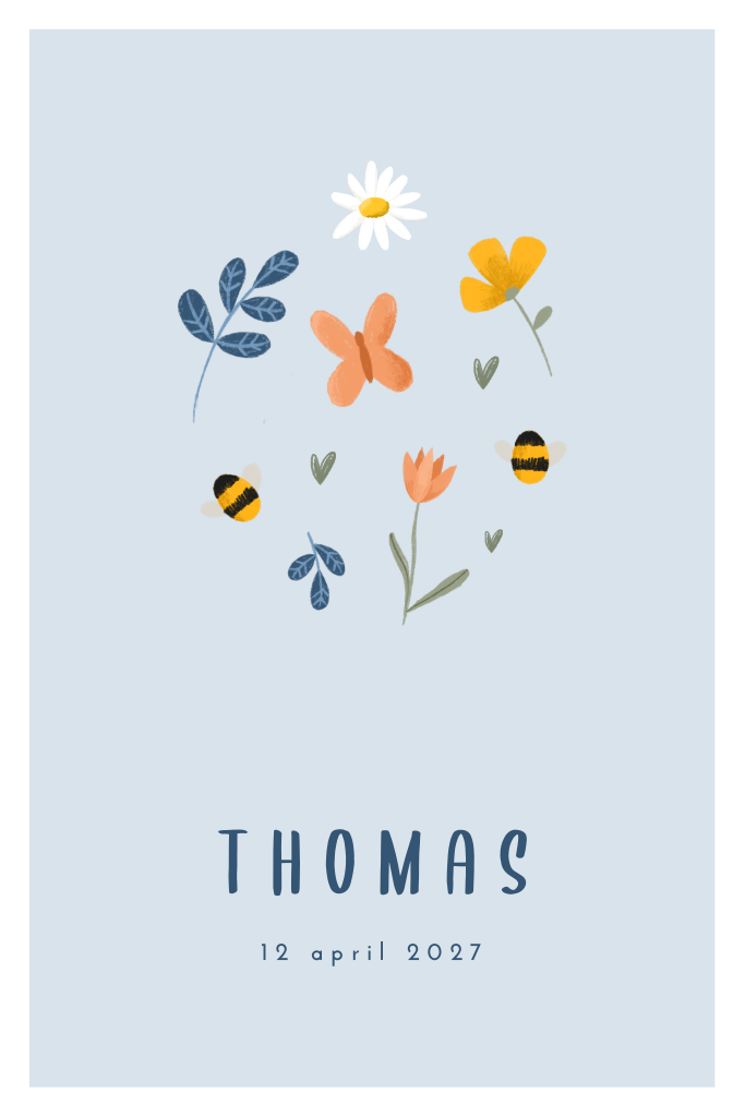 Lichtblauwe geboortekaart geïnspireerd door de lente met bloemetjes, blaadjes en bijtjes. Met moderne en speelse typografie staat de naam van je pasgeboren zoon onderaan de kaart. Op de achterzijde staat de naam nog eens groot op de kaart. Daaronder is ruimte voor de geboortegegevens en de adresgegevens.