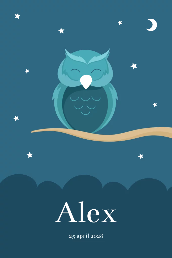 Een schattig geboortekaartje met een blauwe uil die rustig slaapt onder een sterrenhemel. De maan, sterren, snavel én de naam van jullie kindje zijn gedrukt in glanzende goudfolie, wat het kaartje de finishing touch geeft.