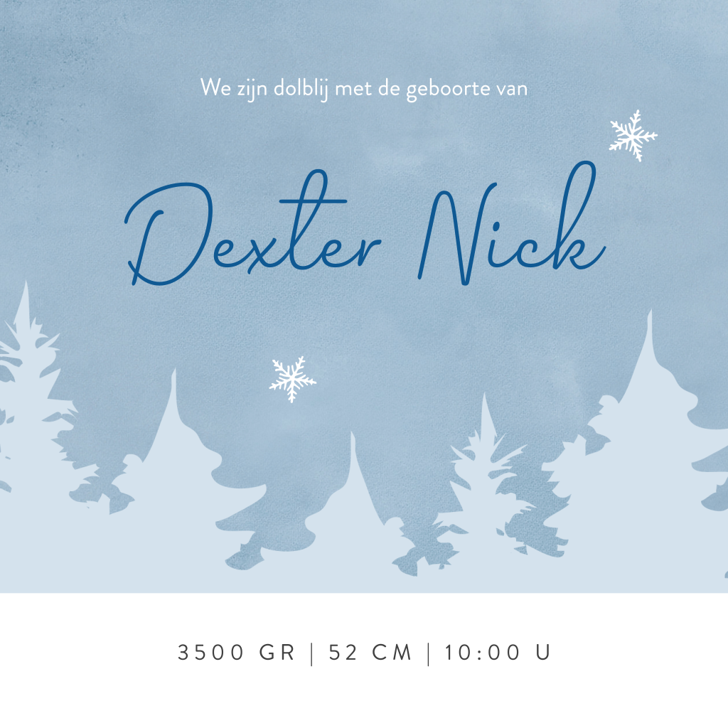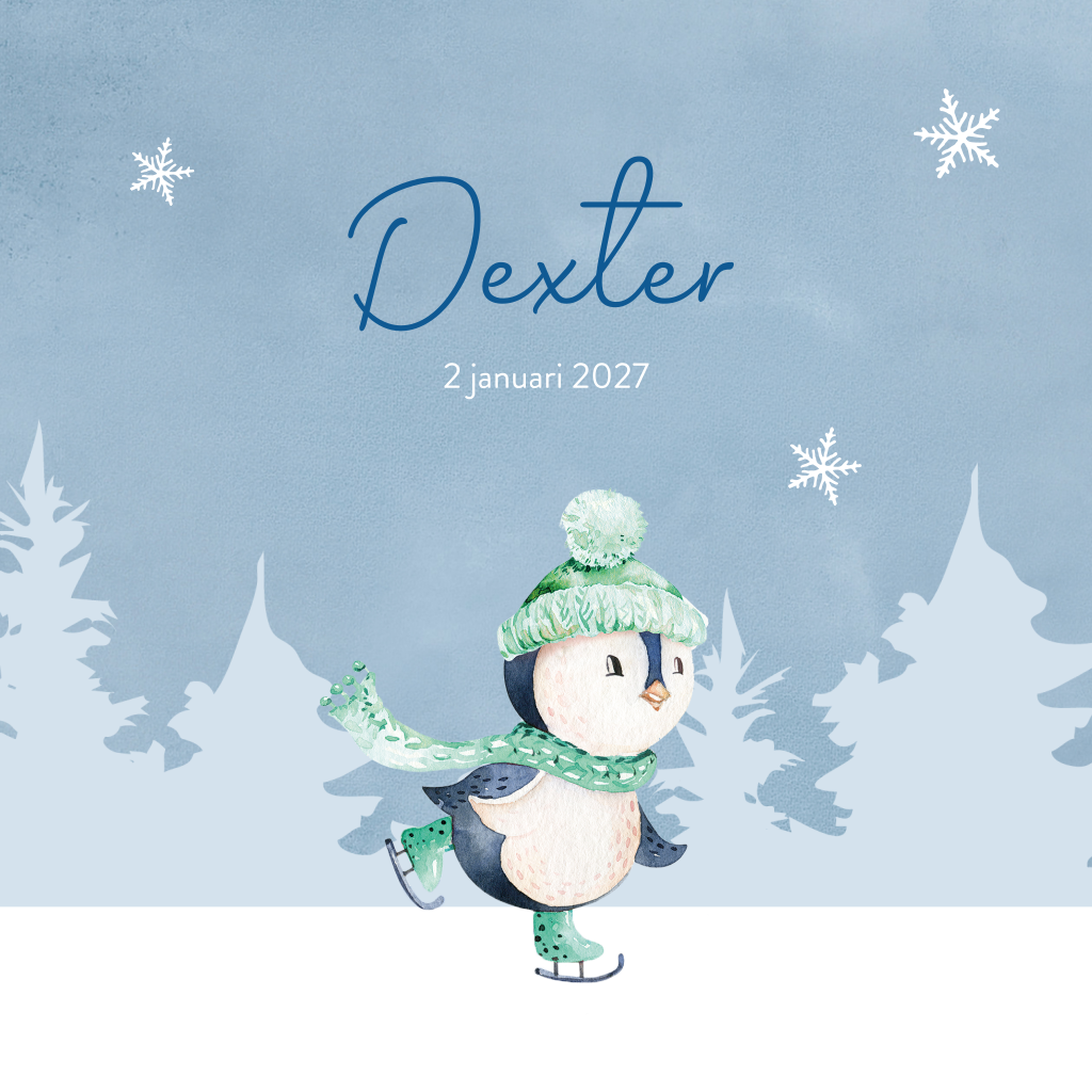 Verwacht je in de winter een zoontje? Ga dan voor dit lieve vierkante geboortekaartje met winters landschap en schaatsende pinguin. De naam van je pasgeboren kindje komt in blauwe letters tussen de sneeuwvlokjes te staan. De schattige illustratie van een schaatsende pinguin komt zowel aan de voor- als binnenzijde voor en er is ruimte voor een mooie quote. Bestel een proefdruk om te zien hoe de kaart er in het echt uit komt te zien.