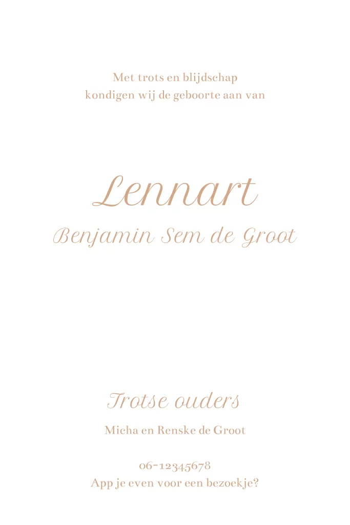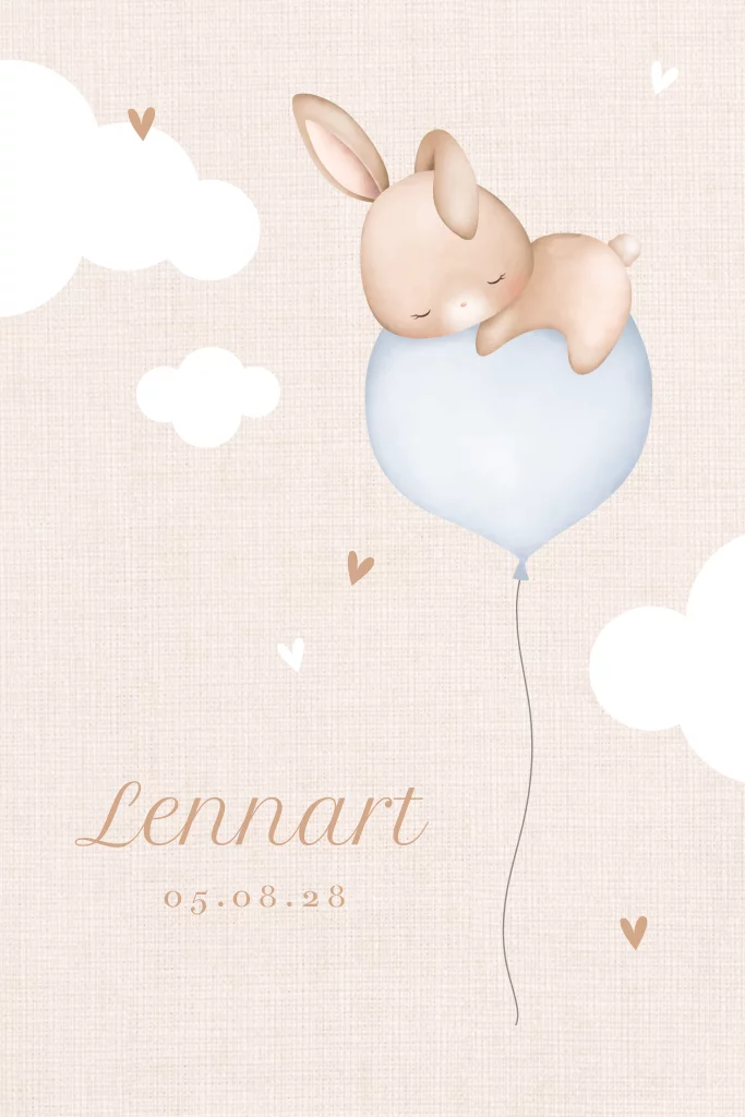 Op een lichtblauwe ballon zweeft dit slapende, schattige konijntje tussen wolkjes en kleine hartjes. Een dromerig geboortekaartje om aan iedereen te laten weten: je hebt een zoontje gekregen! Dit lieve ontwerp is zelf eenvoudig te personaliseren in onze handige editor. Bestel daarna een proefdruk om dit kaartje in het echt te kunnen bewonderen.