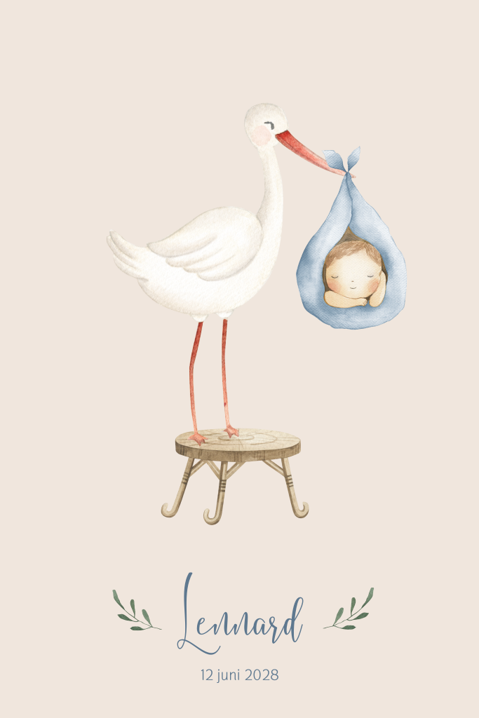 Wat een lief geboortekaartje om de geboorte van jouw zoon aan te kondigen. Mooie illustratie van een ooievaar met een klein baby jongetje in een draagdoek.