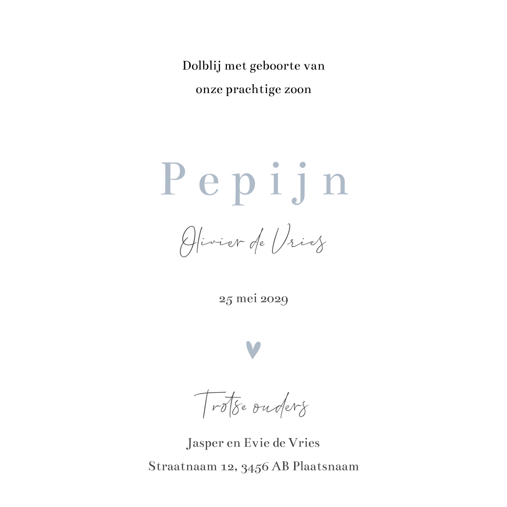 Wit geboortekaartje met lieve illustratie van een vosje op een fiets. De naam van je zoontje komt in klassieke typografie voorop. Pas dit geboortekaartje zelf aan in onze editor, wijzig bijvoorbeeld de lettertypes of geef de achtergrond een kleurtje.