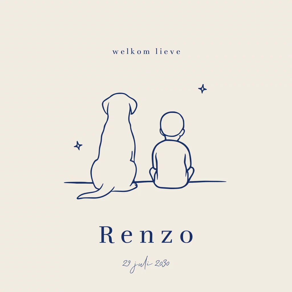 Ben je op zoek naar een uniek geboortekaartje voor een zoontje? Dit stijlvolle geboortekaartje met een minimalistische lijntekening van een jongen met jullie lieve labrador is een prachtige keuze. Het ontwerp is perfect voor hondenliefhebbers of gezinnen met een trouwe viervoeter. Heb je een andere hond? We horen het graag!