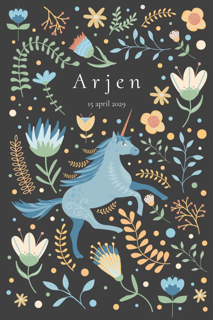 Een betoverend geboortekaartje voor een jongen, met een dromerige blauwe eenhoorn tussen vrolijke bloemen en bladeren. De donkere achtergrond laat de zachte kleuren extra opvallen. Een fantasievol ontwerp dat perfect past bij een sprookjesachtige geboorteaankondiging. Zelf te personaliseren in de editor.