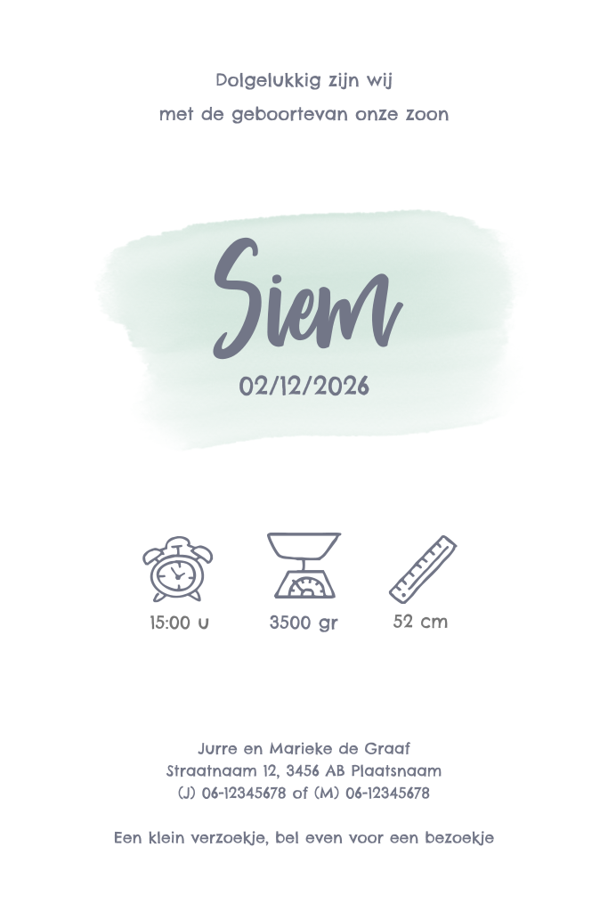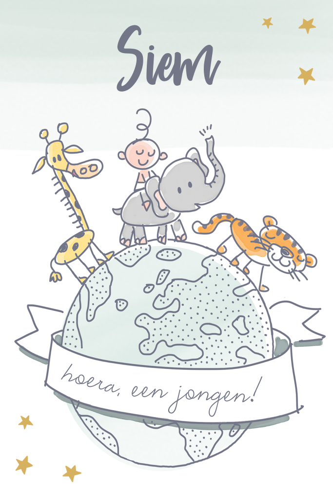Getekend mintgroen geboortekaartje wereldbol met wilde jungle dieren erop. Lief geïllustreerd geboortekaartje met giraf, olifant en tijger. Dit design is erg leuk te combineren met een speels lettertype. De teksten zijn gemakkelijk aan te passen in onze ontwerptool.