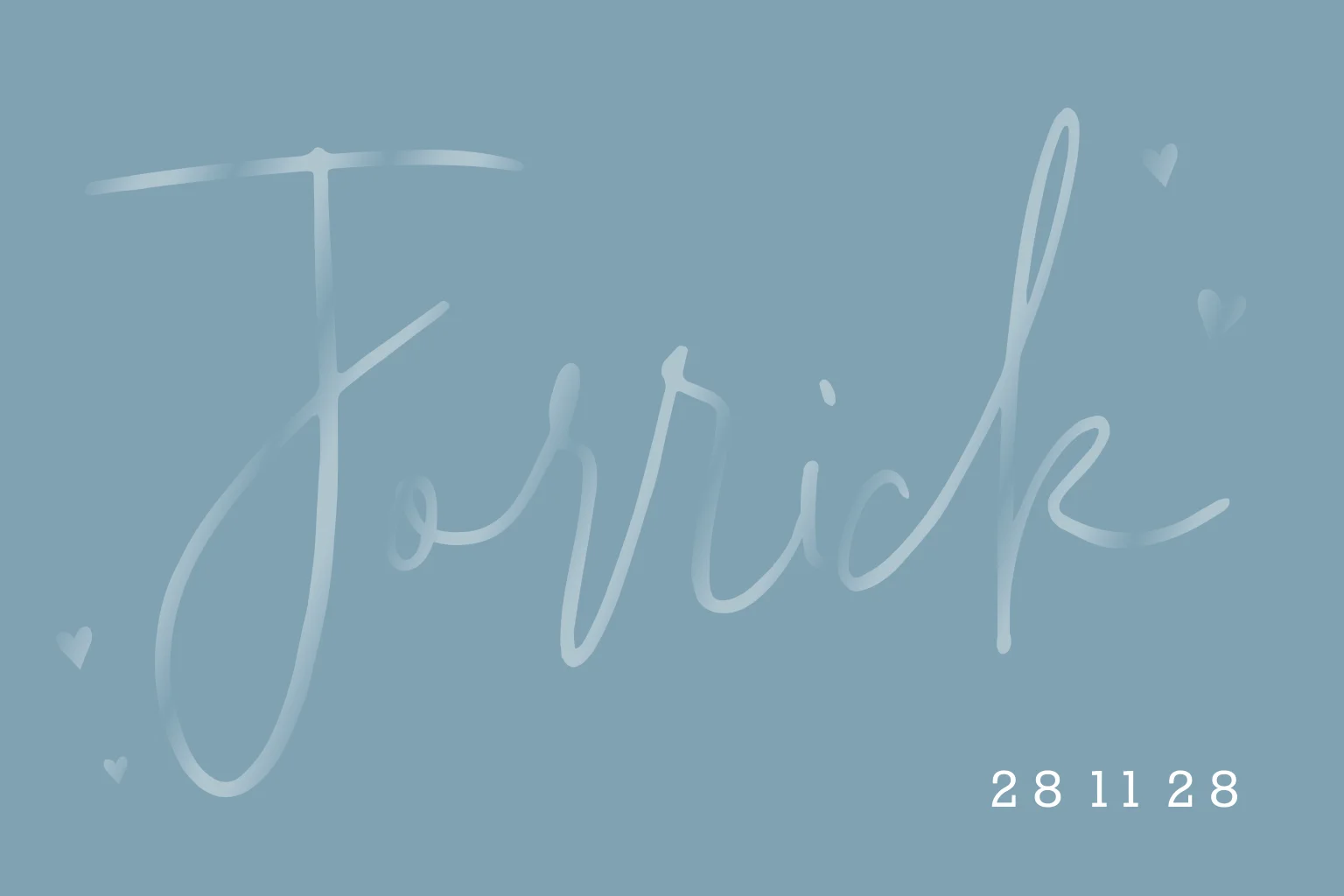 Minimalistisch blauw geboortekaartje met hartjes en naam in hoogglans. De achtergrond en hoogglans elementen hebben dezelfde kleur, dit zorgt voor een heel bijzonder effect. Subtiel en chic! Aan de binnenkant kun je naam van je zoontje terug laten komen. Pas de lettertypes zelf aan in onze handige tool.