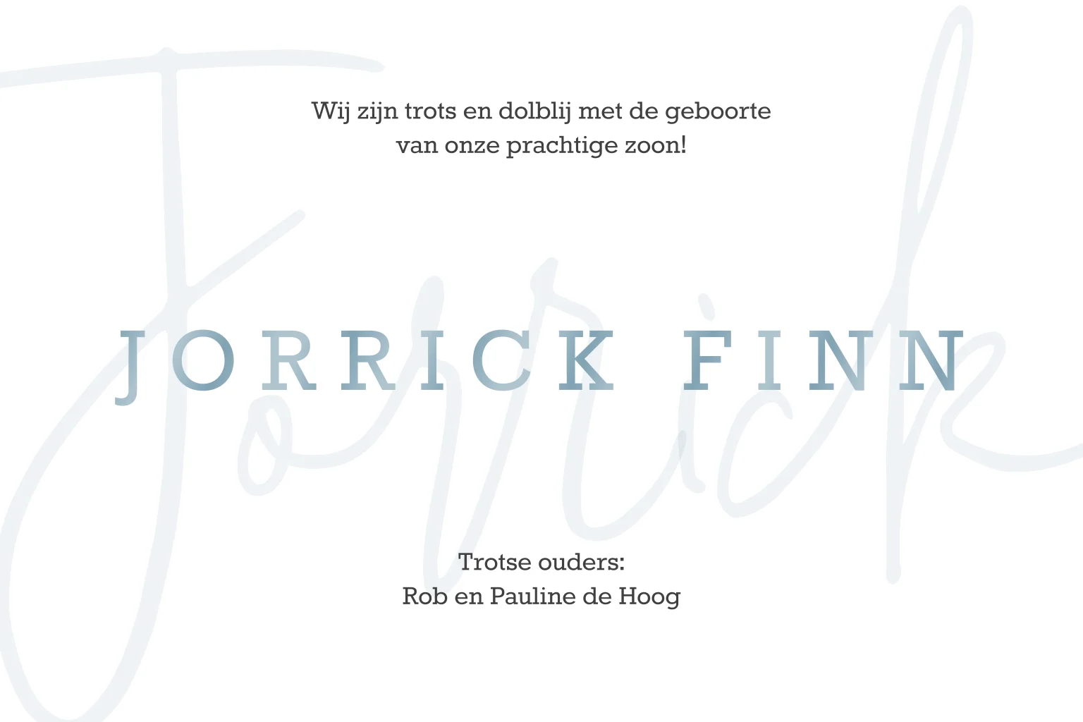 Monochroom blauw geboortekaartje met naam in hoogglans