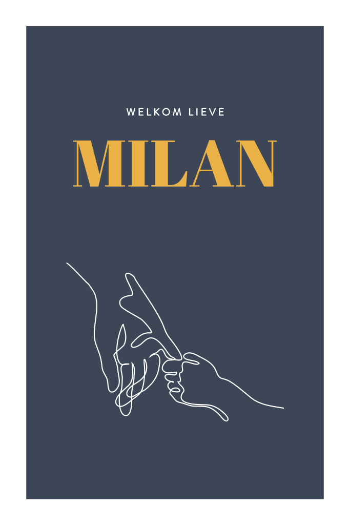 Oneline geboortekaartje voor een jongen met baby en volwassen hand. Dit lieve geboortekaartje is perfect voor de geboorte van een zoontje. Voorop een smaakvolle oneline tekening van een babyhandje die de pink van een volwassen hand vast houdt. Hoe schattig is dit. In de stoere kleur donkerblauw. Pas zelf de teksten, lettertype en kleuren aan en bestel een drukproef.