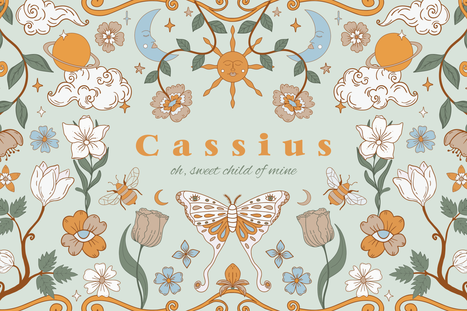 Kleurrijk geboortekaartje met bohemian illustraties van bloemen, bijtjes, vlinder, maan, zon en meer. Een boho geboortekaartje met een retro tintje. Pas de achtergrondkleur of lettertypes zelf aan in onze handige editor.