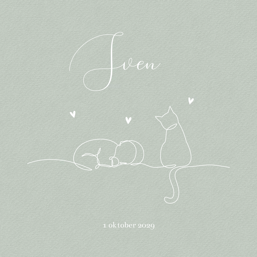 Pastelgroen geboortekaartje met baby jongen en kat in zilverfolie