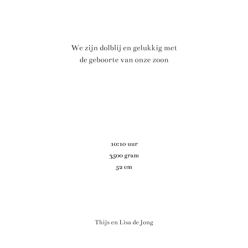 Je kunt dit geboortekaartje eenvoudig naar wens aanpassen met onze gebruiksvriendelijke editor. Voeg persoonlijke teksten, kleuren en andere details toe, zodat het helemaal aansluit bij jouw stijl en wensen. Ook kun je een proefdruk bestellen, zodat je zeker weet dat het kaartje helemaal naar wens is voordat je de definitieve bestelling plaatst.