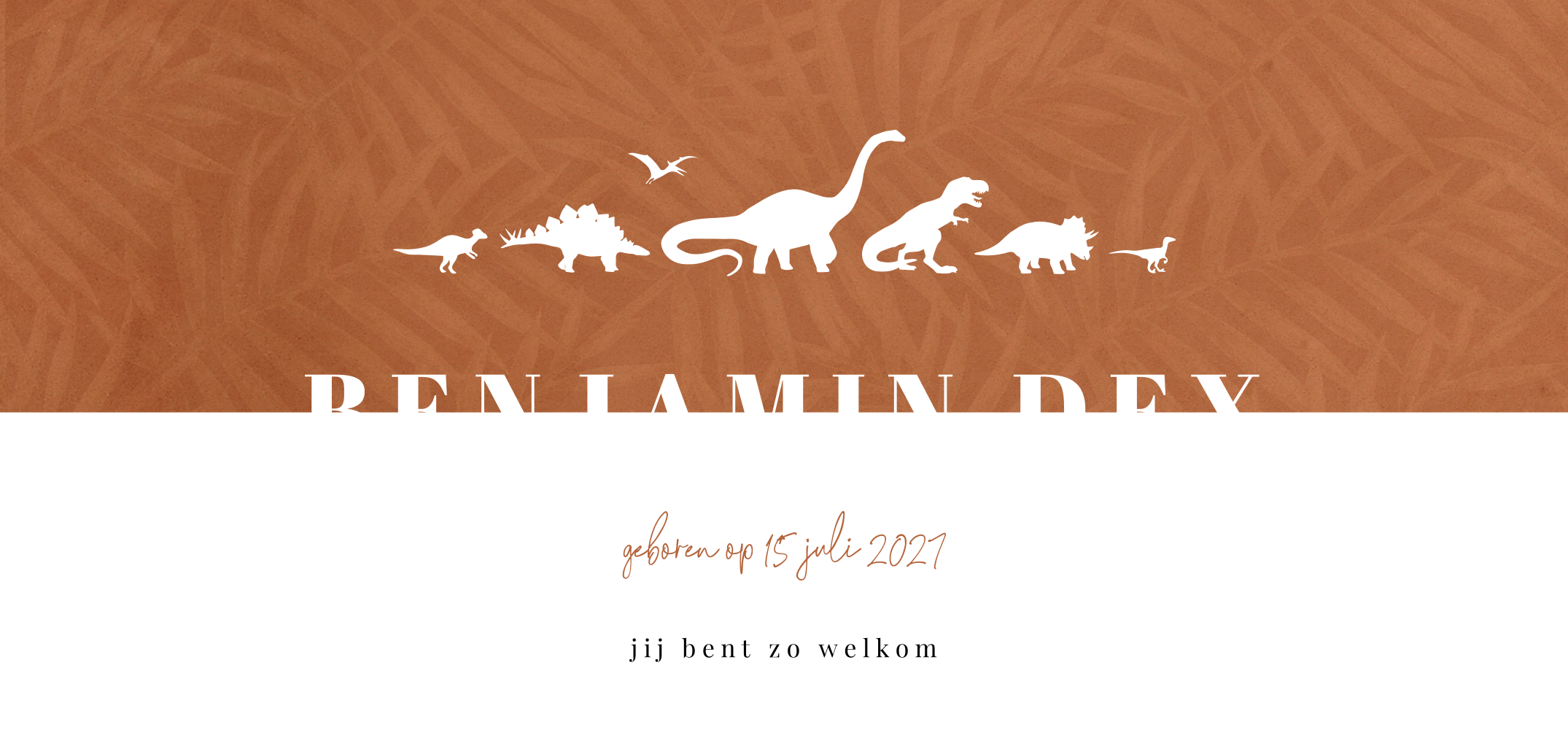 Op een roestrode achtergrond van tropische bladeren staat een rijtje witte silhouetjes van verschillende dino's en de naam van je zoontje in goudfolie letters. De trendy kleur in combinatie met foliedruk maakt dit tot een hip kaartje. Op de achterkant van dit enkele kaartje komen de dino's terug en kun je de geboortegegevens van je kindje plaatsen.