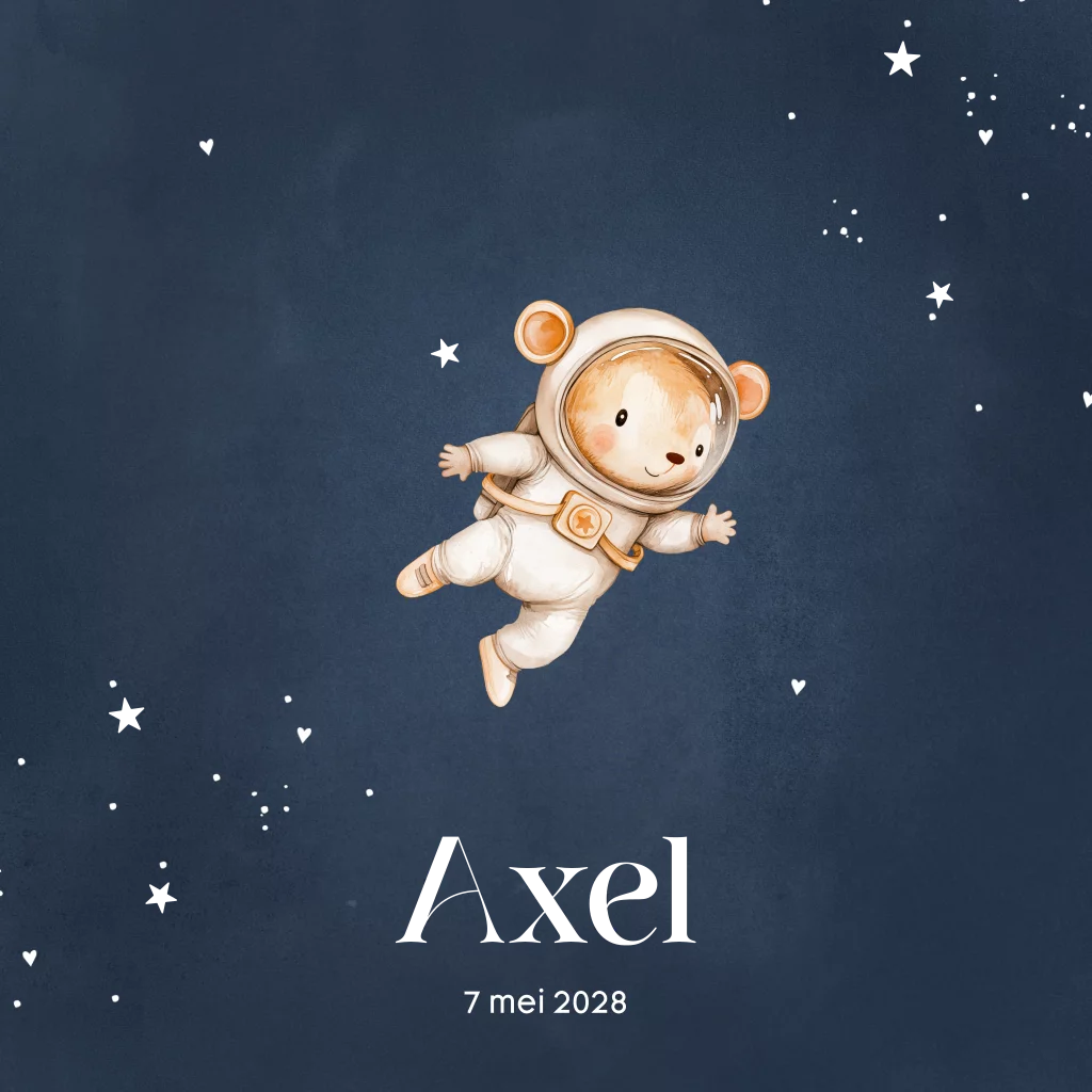 Op zoek naar een geboortekaartje met astronaut, raket en sterren? Dit dromerige ruimtekaartje met donkerblauwe achtergrond en schattig beertje in astronautenpak is perfect voor kleine ruimtereizigers. Achterop staat een stoere raket en binnenin vind je een planeet – een compleet ruimte-avontuur in kaartvorm!