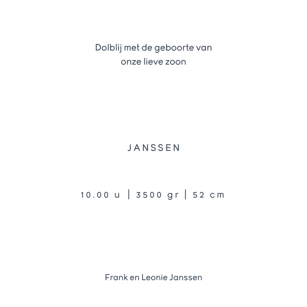 Je kunt dit geboortekaartje helemaal zelf bewerken in onze editor. Voeg je eigen tekst toe, kies het lettertype en pas kleuren aan. Bestel een drukproef om het ontwerp vooraf thuis te bekijken.