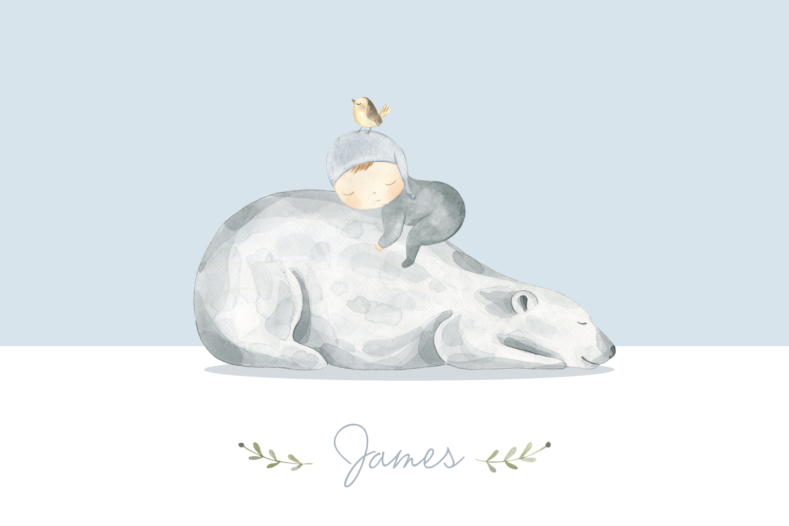 Aquarel geboortekaartje met een slapende ijsbeer met op z'n rug een slapend baby jongetje. Daarop zit een lief klein vogeltje.