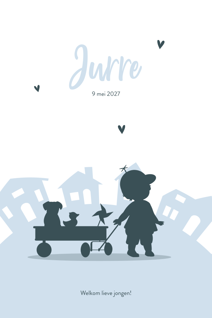 Staand silhouet geboortekaartje met jongetje en huizen. Zoek je een vrolijk geboortekaartje? Misschien is dit ontwerp wel wat voor jou. Op de voorzijde loopt een jongetje met een grote kar vol speelgoed achter zich. De kaart is versierd met donkerblauwe hartjes. Op de achterzijde kun je alle gegevens kwijt. Alle kleuren kun je aanpassen in onze ontwerptool, zo maak je het geboortekaartje nog persoonlijker.