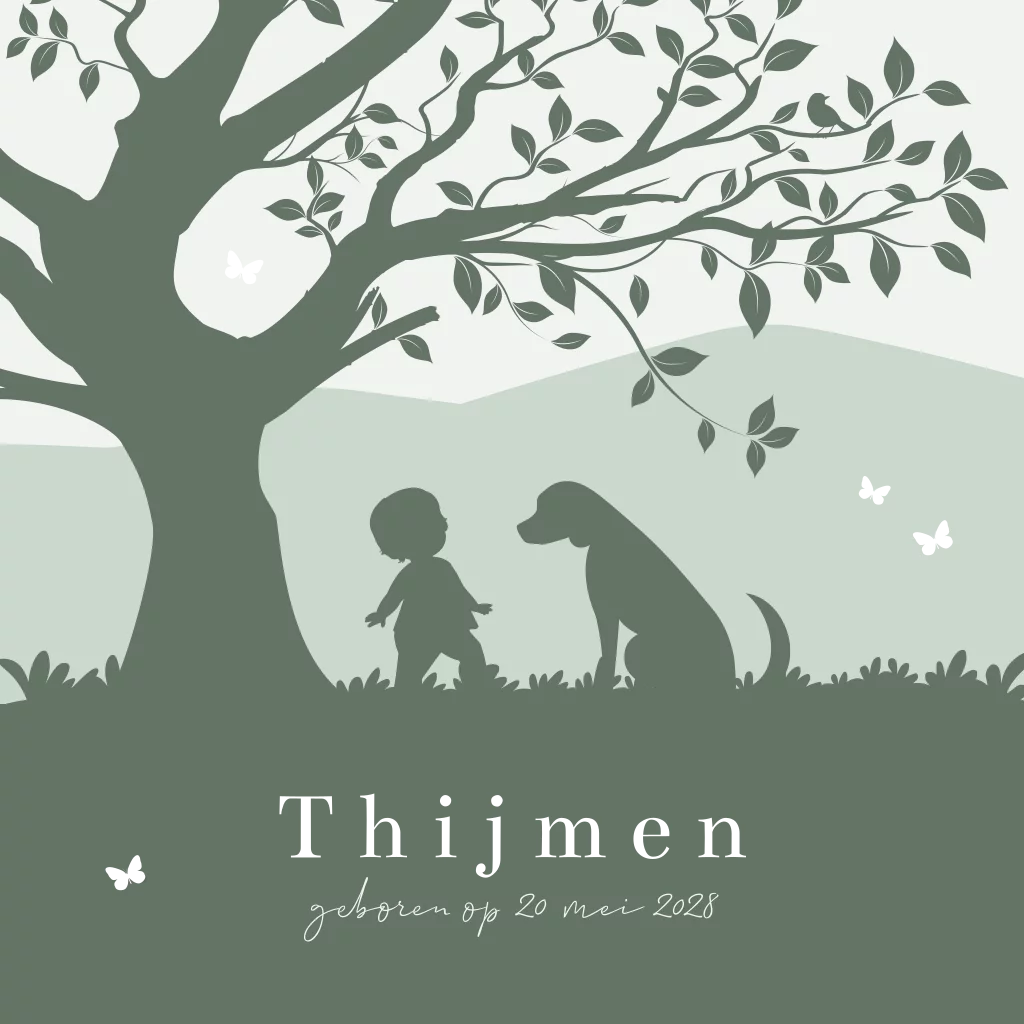 Silhouet geboortekaartje met jongetje en hond onder boom