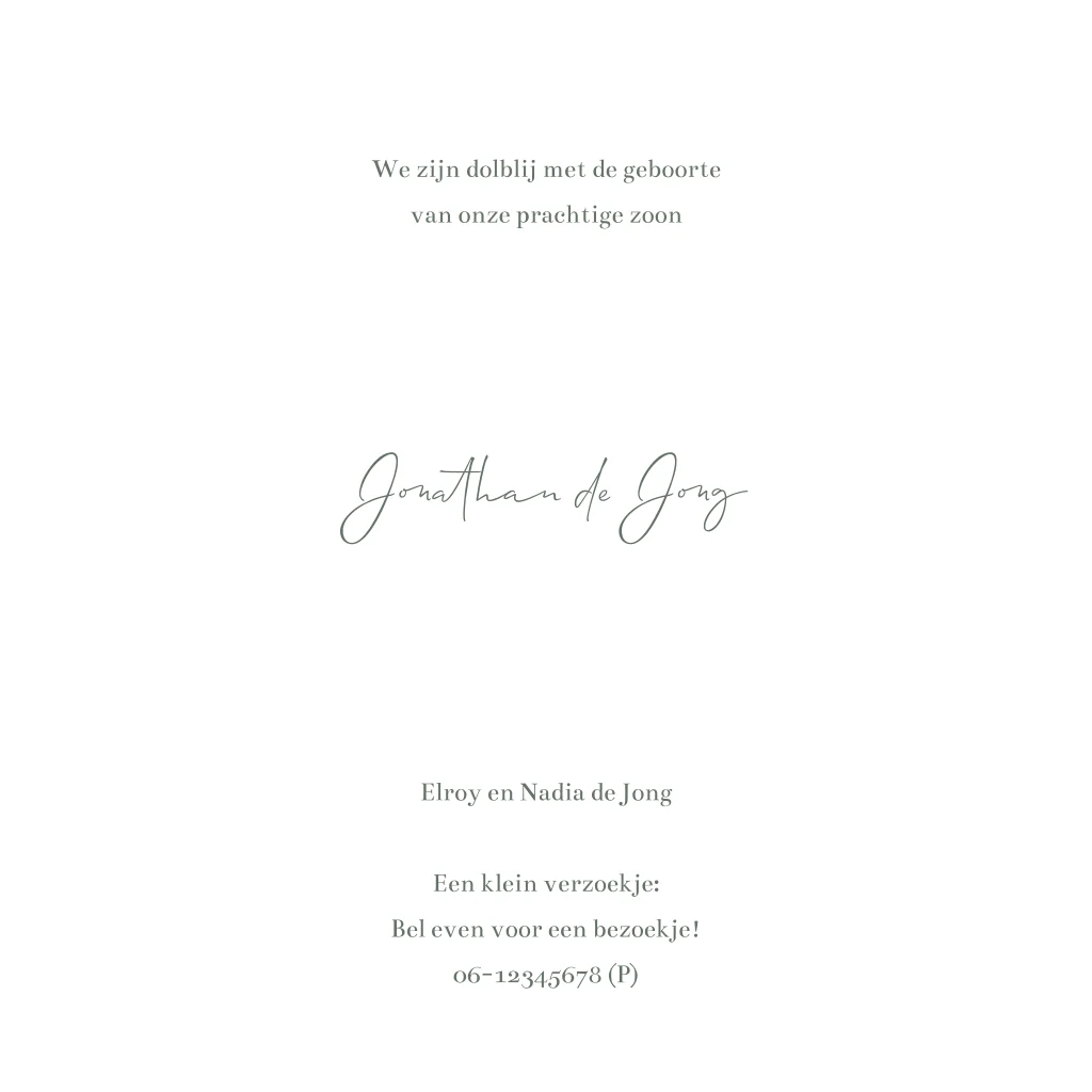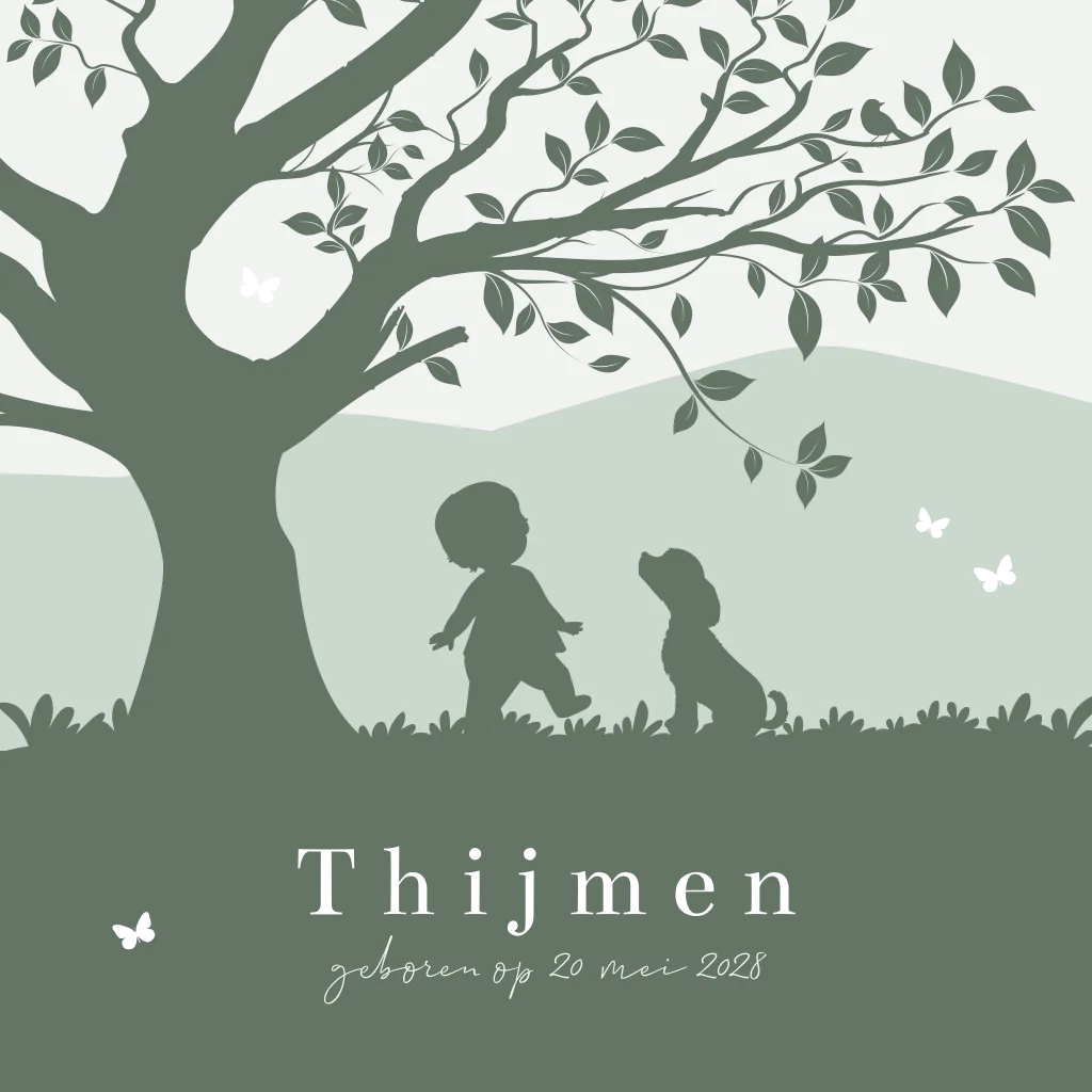 Op zoek naar een leuk geboortekaartje voor je zoontje? Ga voor dit lieve silhouet ontwerp met een grote boom, een klein jongetje en een lieve hond. De naam van je zoontje komt in glimmende, gouden letters voorop en ook de vlindertjes worden afgedrukt in goudfolie. De kleuren van de illustraties en teksten zijn eenvoudig zelf aan te passen in onze ontwerptool.