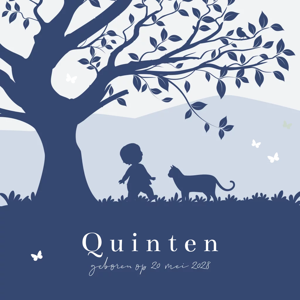 Silhouet geboortekaartje met jongetje en kat onder boom