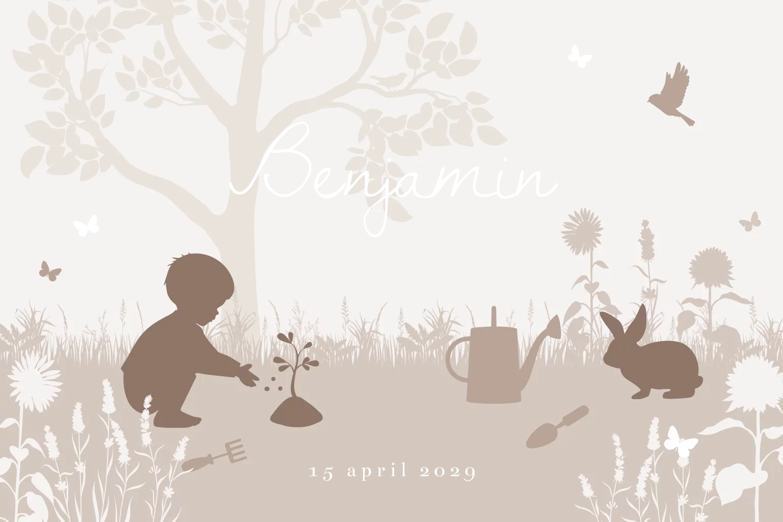 Verwelkom je zoontje met dit vrolijke, beige silhouet geboortekaartje! Een lief jongetje, een weelderige tuin vol bloemen en een schattig konijntje komen tot leven in zachte beige kleuren en subtiele goudfolie accenten. Het jongetje plant een nieuw plantje, een prachtige weerspiegeling van het nieuwe leven dat nu gevierd mag worden. Perfect voor een lente- of zomerkindje! Pas dit ontwerp aan in onze handige editor en bestel een proefdruk.