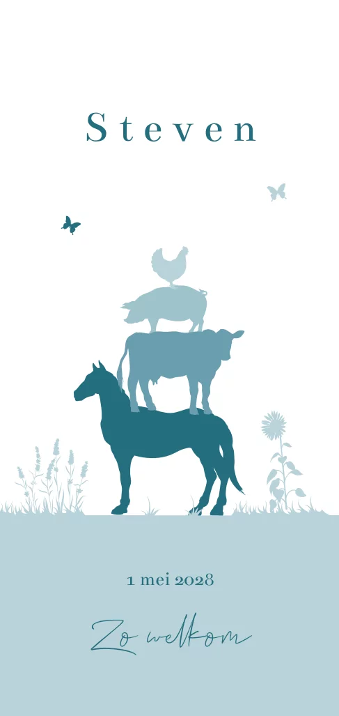 Schattig silhouet geboortekaartje voor een jongen in blauwtinten met gestapeld boerderijdieren van donker naar lichtblauw. Van onder naar boven zie je een paard met daarop een koe, varken en bovenop een haan. Je kunt de kaart zelf aanpassen met de ontwerptool. Bestel een proefdruk om te zien of dit kaartje in het echt ook net zo mooi is.