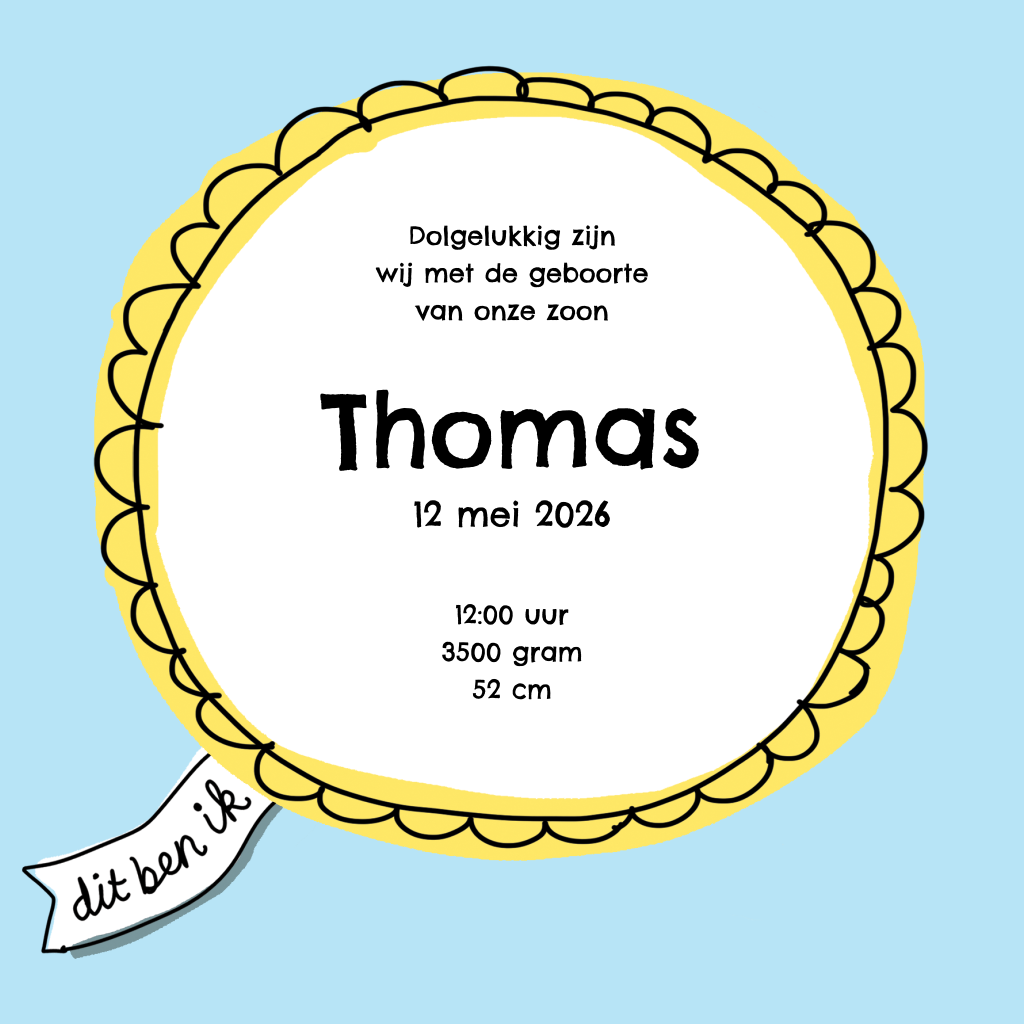 Hoera, er is een jongen geboren! Bestel dit getekend geboortekaartje baby jongen met pet en blauwe achtergrond om iedereen dit mooie nieuws te laten weten. Op dit vrolijke kaartje zie je een breed lachende baby met een stoere blauwe pet. Binnenin zie je diverse soorten speelgoed en de naam en geboortegegevens staan in een gele rozet op lichtblauwe achtergrond.