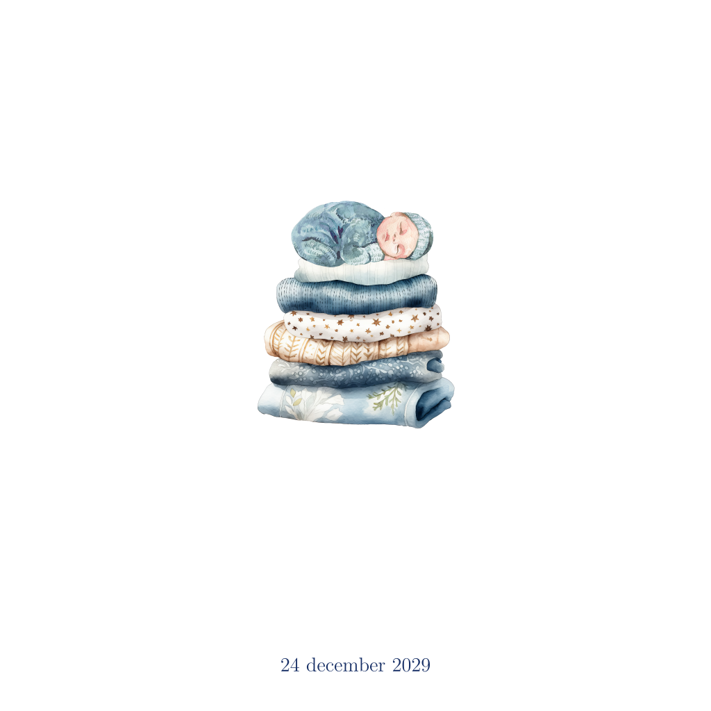 Winter geboortekaartje voor als je zoon einde van het jaar geboren gaat worden. Op dit lieve kaartje staat een stapel met warme dekens waarop een lief klein baby jongetje ligt te slapen. Er staan kleine goudfolie sterretjes omheen en de naam eronder staat ook in goudfolie. Achterop staan de geboortegegevens met leuke kleine icoontjes als een trui, muts en een sjaal. Pas het ontwerp eenvoudig aan met de editor en vraag een drukproef aan.