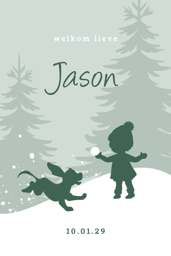 Een hondje en jongetje spelen vrolijk in de sneeuw. Op de achtergrond staan grote dennenbomen. Een perfect geboortekaartje voor een kleine jongen die in de winter geboren wordt! Pas dit kaartje zelf aan in onze ontwerptool om er je eigen draai aan te geven. Liever een ander hondje of silhouet kindje? Kijk eens in de editor voor allerlei verschillende silhouetjes.