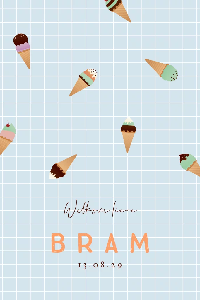 Schattig geboortekaartje voor een jongen met een vrolijk patroon van diverse ijsjes, geplaatst op een zachtblauwe achtergrond met witte ruitjes. Heerlijk zomers! Heb je liever een andere achtergrondkleur? Pas dit kaartje gemakkelijk aan naar jouw smaak met onze handige ontwerptool en bestel een proefdruk.