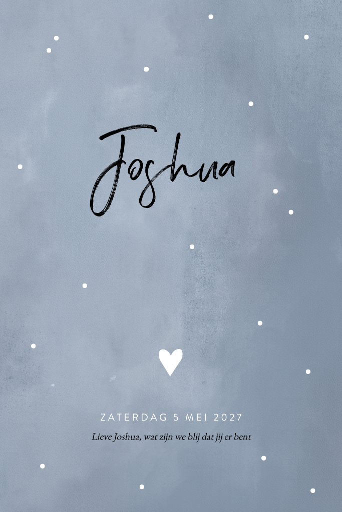 Een lief geboortekaartje met zachtblauwe waterverf achtergrond, witte stipjes en een hartje. In speelse letters komt de naam van je zoontje voorop, omringd door polkadots. Het hartje geeft dit kaartje een lieve finishing touch. Op de achterzijde kun je alle geboortegegevens van je kindje plaatsen. Hoe laat is hij geboren en hoe groot was hij? Eronder is ook nog ruimte voor een mooie zin of quote.