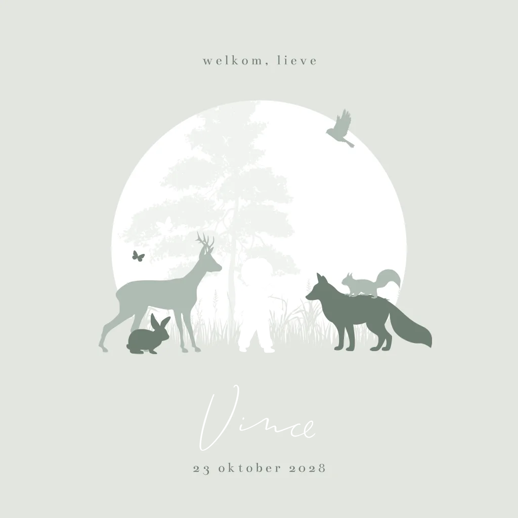 Zachtgroen geboortekaartje met bosdieren en silhouet jongen