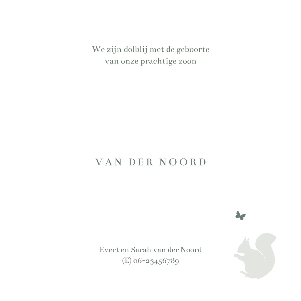 Wordt er in de herfst een jongetje geboren? Kondig zijn geboorte aan met dit prachtige geboortekaartje met zachtgroen en koperfolie. Op dit lieve kaartje hebben we gekozen voor een betoverend tafereel, geïnspireerd door het serene bos. Tussen de bomen en naast een silhouet jongen staan nieuwsgierige bosdiertjes zoals een vos, hertje en eekhoorn. Een kleine vogel vliegt in de lucht, een symbool van vrijheid en nieuwe avonturen. Pas dit geboortekaartje met silhouetjes zelf aan in onze editor en bestel een proefdrukje.