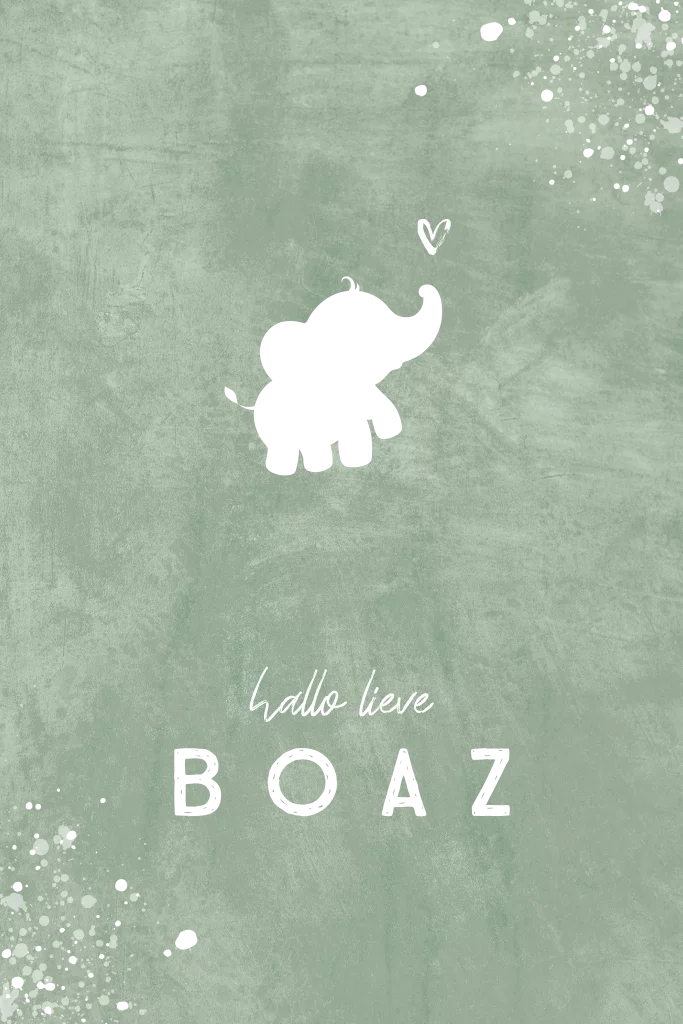 Zachtgroen geboortekaartje met spetters, goudfolie olifantje en een hartje. Een lief kaartje om de komst van je kindje mee aan te kondigen. Liever een ander lettertype? Pas dit ontwerp zelf aan in onze handige editor.