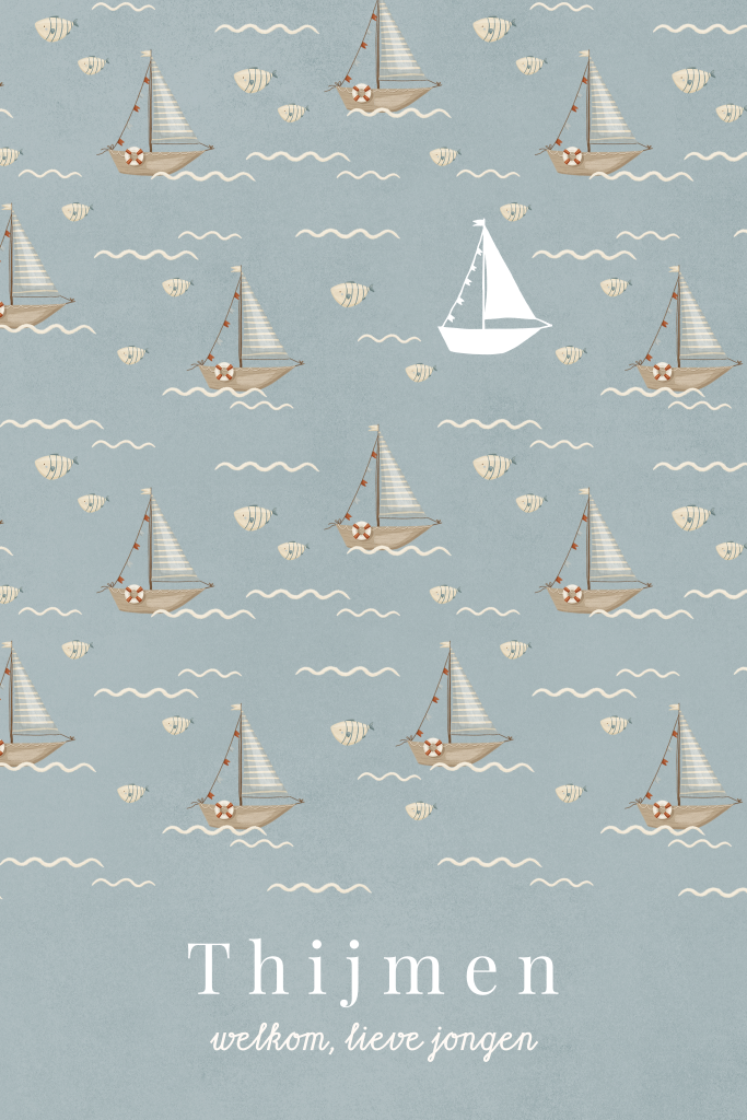 Op zoek naar een maritiem geboortekaartje voor jouw aanstaande zoontje? Kondig zijn komst aan met dit blauwe geboortekaartje met bootjes, visjes en goudfolie! Eén van de bootjes plus de naam van je zoontje worden in goudfolie gedrukt. Pas deze kaart zelf aan in onze editor.