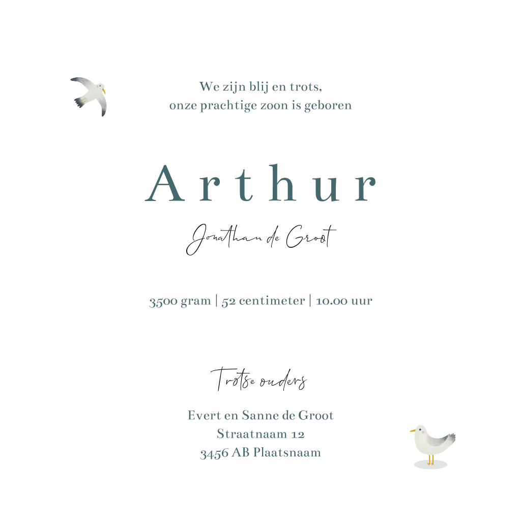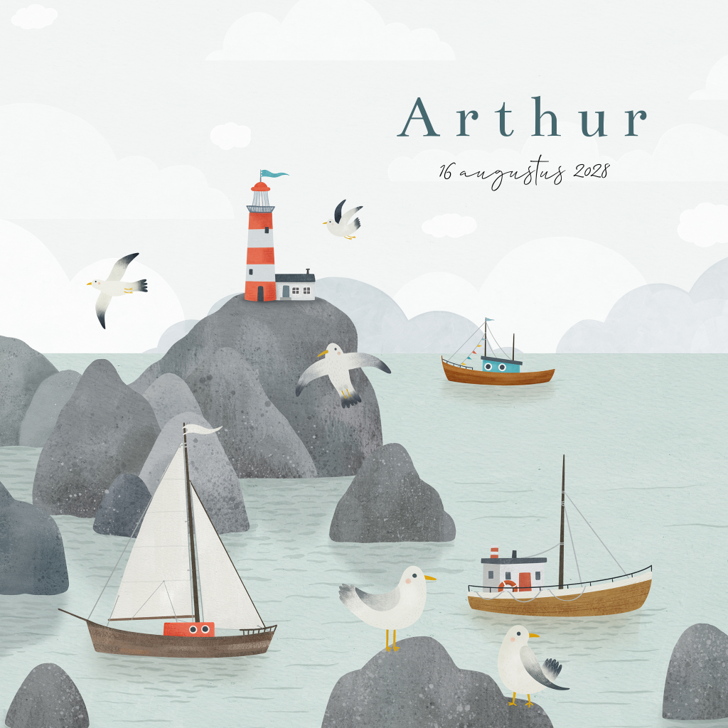 Op zoek naar een mooi geboortekaartje met zee thema voor je aanstaande zoontje? Ga voor dit prachtige ontwerp met illustratie van een zee landschapje met bootjes, een vuurtoren en vrolijke meeuwtjes. Aan de binnenzijde is ruimte voor een lief gedichtje en komen verschillende elementjes uit de illustratie terug.