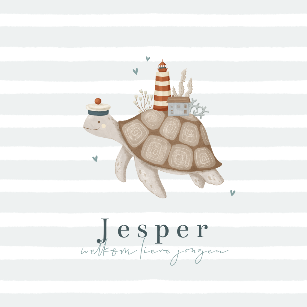 Zee geboortekaartje jongen met schildpad en vuurtoren